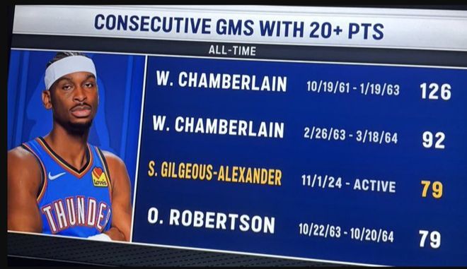 雷霆是真的强,今天上场的12名球员全部得分,8人得分上双,鸭梨连续79场20+追平大O历史第三,前两名都是张大帅,鸭梨现役第一人。